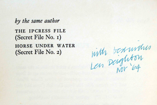 First edition of his third book, presentation copy, inscribed by him in green ink on the “by the same author†page, just opposite the title page: “with best wishes/Len Deighton/Nor[?] ’64.â€