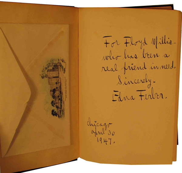 Presentation copy, with a lovely inscription by Ferber on the first blank: “For Floyd Millis -/who has been a/real friend in need./Sincerely -/Edna Ferber./Chicago/April 30/1947.†On the opposite page (the verso of the front free endpaper), the previous owner, Floyd Millis, has affixed an envelope from the Hotel Windermere in Chicago, and in that envelope is the following two octavo page letter on hotel stationery from Ferber to him: