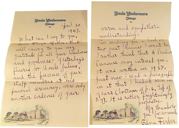 This warm and meaningful letter demonstrates Ferber’s kind nature. Edna Ferber (1885-1968), was a successful and prolific author, several of whose books (Showboat, Cimarron, and Giant) were the basis of musicals and films.
