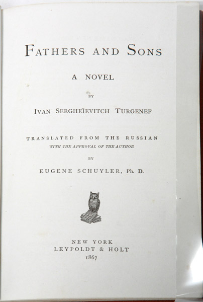 Fathers and Sons. A Novel. Translated from the Russian with the Approval of the Author by Eugene Schuyler, Ph. D. New York: Leypoldt & Holt, 1867.