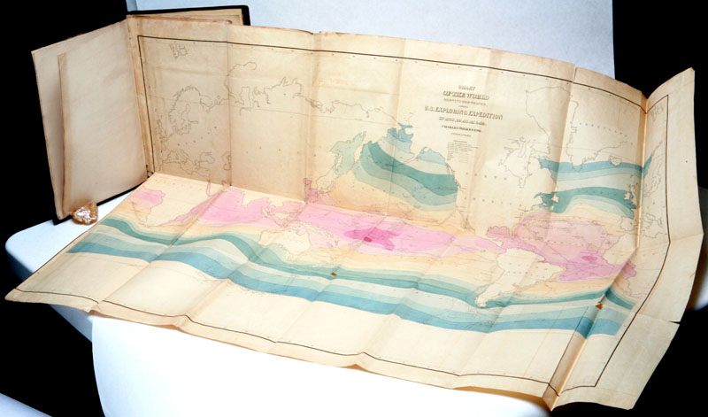 The Atlas includes 5 large fold-out maps: (1) Chart of the world showing the routes of the vessels of the U.S. Exploring Expedition (hand-colored); (2) Chart of the Antarctic Continent; (3) Chart of the Viti or Feejee (Fiji) Islands; (4) Map of the Oregon Territory; (5) Map of part of the island of Hawaii, Sandwich Islands, showing the craters and eruption of May and June, 1840. All of the maps are 25 1/2†x 36†except for #5 Hawaii, which is 17 1/2†x 24â€.