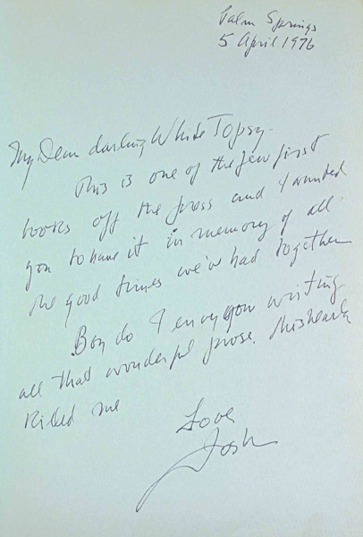 First edition. Presentation copy, with an excellent inscription by Logan on the front free endpaper: “Palm Springs/5 April 1976/ My Dear darling White Topsy -/This is one of the few first/books of the press and I wanted/you to have it in memory of all/the good times we’ve had together./Boy do I envy you writing/all that wonderful prose. This nearly/killed me./Love/Josh.â€
