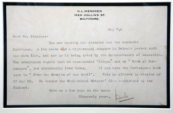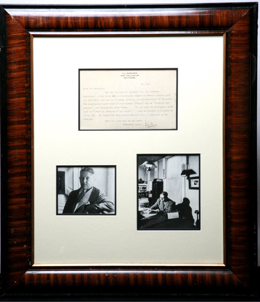 One horizontal octavo page on personal stationery (“1524 Hollins St./Baltimore.â€) Usual fold lines, one small soil mark, else fine. Matted with two images of Mencken, glazed and framed. Size: 199 x 128 mm. Addressed “Dear Mr. Stearns,â€: