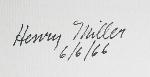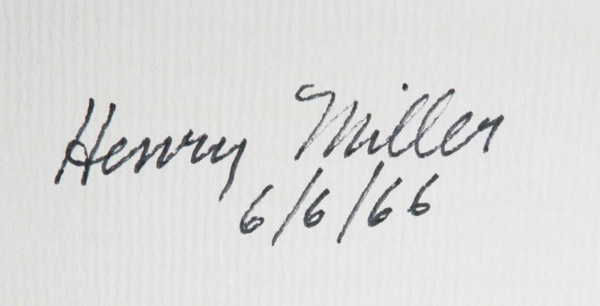 First edition, one of 99 copies signed by Henry Miller (dated “6/6/66â€) on the signed page in the rear, out of a total of 1,399 copies (including 26 lettered “Leather Inscription Ed.†and the standard “Cork Edition.â€