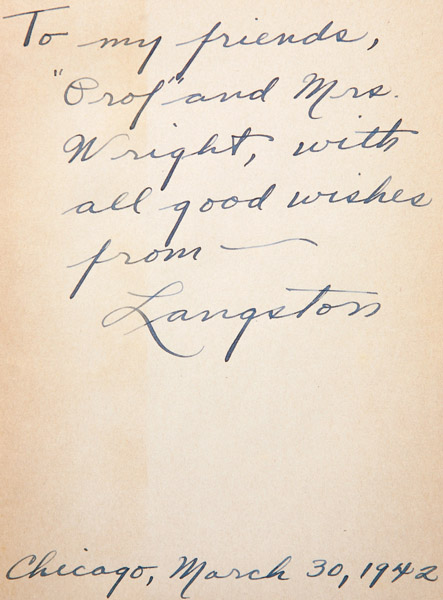 First edition. Presentation copy inscribed by Hughes on the front free endpaper: “To my friends, “Prof.†and Mrs. Wright, with all good wishes from [dash] Langston. Chicago, March 30, 1942.â€
