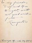 It is unknown to whom '"Prof." Wright" refers. One possibility is Bruce M. Wright (1918-2005), who became a member of the New York State Supreme Court known for challenging large bail amounts for poorer people; Judge Wright was heavily involved in the Harlem Renaissance and knew Hughes well (Hughes had edited Wright's book of poetry, From the Shaken Tower (1944)). Another possibility is Walter Livingston Wright, who was the president of Lincoln University from 1924-1926 and again from 1936-1945. It is likely Hughes knew Walter Wright, as Hughes' graduating class was 1929, and he would have attended the university during Wright's first presidency. Of course, it is always possible that this was inscribed to Hughes' friend, novelist Richard Wright (his most famous novel being Native Son, 1940), but we have found no proof of this.