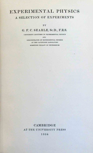 Searle (1864-1954) was a Fellow of the Royal Society, and worked at the Cavendish Laboratory for most of his career. This book describes several experiments he undertook as a university lecturer, and contains experiments on Mechanics, Elasticity, Surface Tension, Viscosity, Heat and Sound.