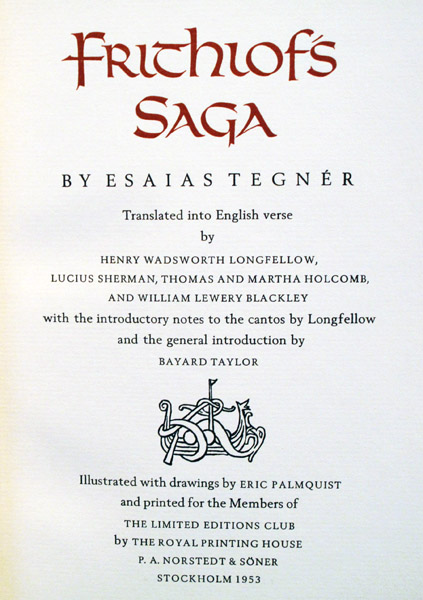 Frithiof's Saga. Translated into English verse by Henry Wadsworth Longfellow, Lucius Sherman, Thomas and Martha Holcomb, and William Lewery Blackley with the introductory notes to the cantos by Longfellow and the general introduction by Bayard Taylor Stockholm: The Limited Editions Club, 1953.