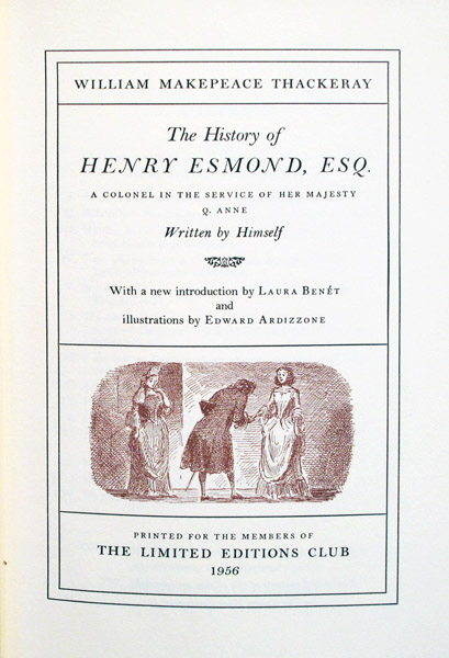 The History of Henry Esmond, Esq. A Colonel in the Service of Her Majesty Q. Anne. Written by Himself. With a new introduction by Laura Benet and illustrations by Edward Ardizzone [New York]: The Limited Editions Club, 1956.