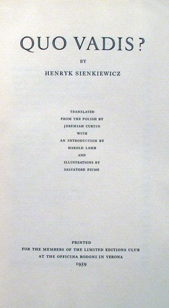 Quo Vadis?. Translated from the Polish by Jeremiah Curtin with an introduction by Harold Lamb and illustrations by Salvatore Fiume Verona: The Limited Editions Club, 1959.