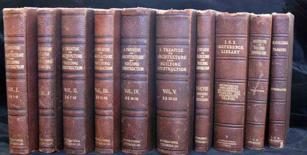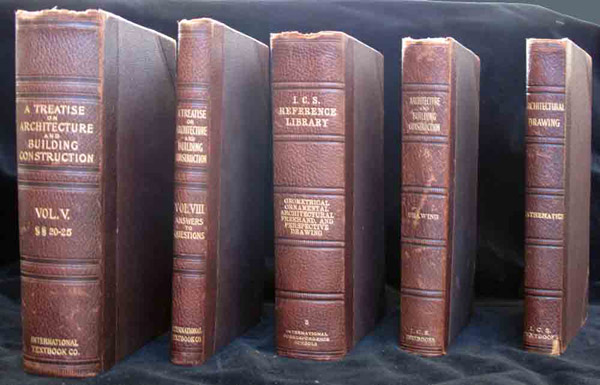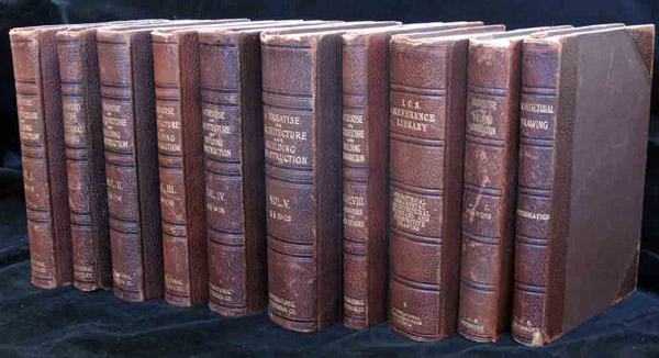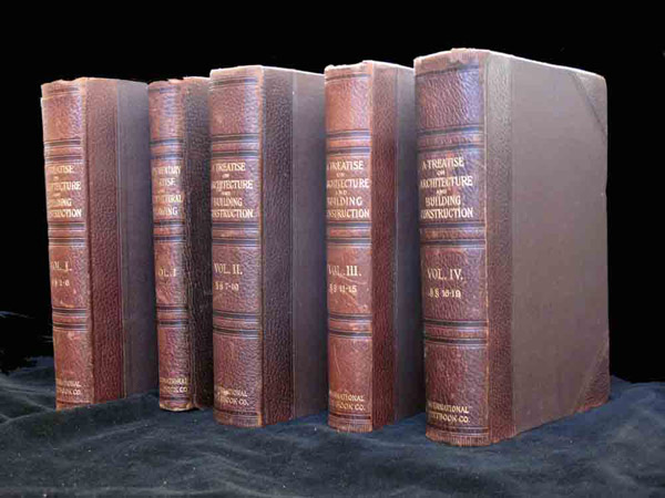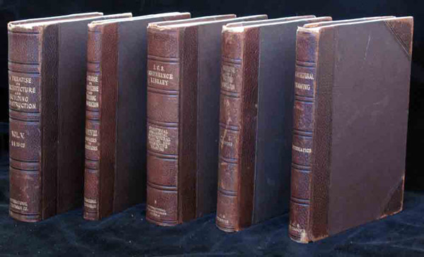 Six octavo volumes. Volumes I – V, VIII (out of eight). These volumes contain subjects such as: Arithmetic, Formulas, Geometry and Mensuration, Architectural Engineering, Masonry, Carpentry, Joinery, Stair-Building, Ornamental Ironwork, Roofing, Sheet-Metal Work, Electric-Light Wiring, Bellwork, Plumbing and Gas-Fitting, Heating and Ventilation, Painting and Decorating, Estimating and Calculating Quantities, History of Architecture, Architectural Design, Specifications, Building Superintendence, Contracts and Permits, and Answers to Questions.