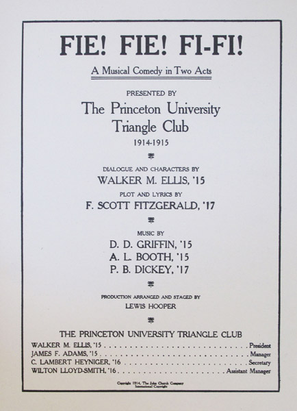 Fie! Fie! Fi-Fi!. A Musical Comedy in Two Acts. Presented by The Princeton University Triangle Club 1914-1915. Dialogue and Characters by Walker M. Ellis, '15. Plot and Lyrics by F. Scott Fitzgerald, '17. Cincinnati, New York & London: The John Church Co., 1914.
