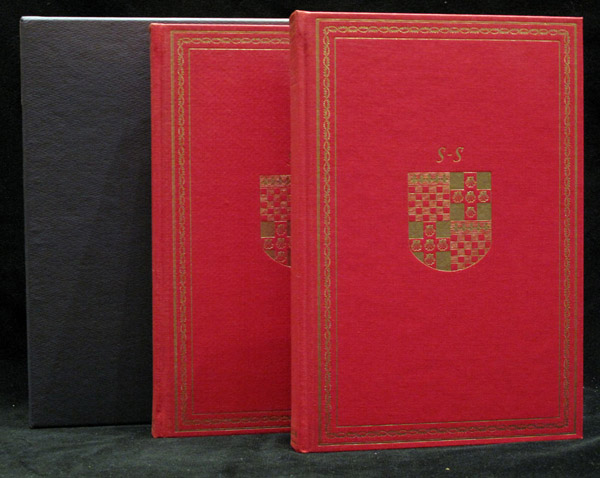 Two volumes. Quarto [xxxii], [1]-252, [4, blank] pp. With 17 inserted plates, including a frontispiece, plus an inserted pull-out genealogical table; [xvi], 253-498, [1, blank], [1, signed limitation page] pp. With 15 inserted plates, including a frontispiece, plus an inserted pull-out genealogical table. Publisher's full red cloth, spine lettered in gilt, front cover decoratively stamped with gilt, top edge stained red. From the library of Rudy Simons, with his bookplate to front pastedown and stamp to rear pastedown of each volume. Both volumes fine with original, sunned and rubbed, dual slipcase.