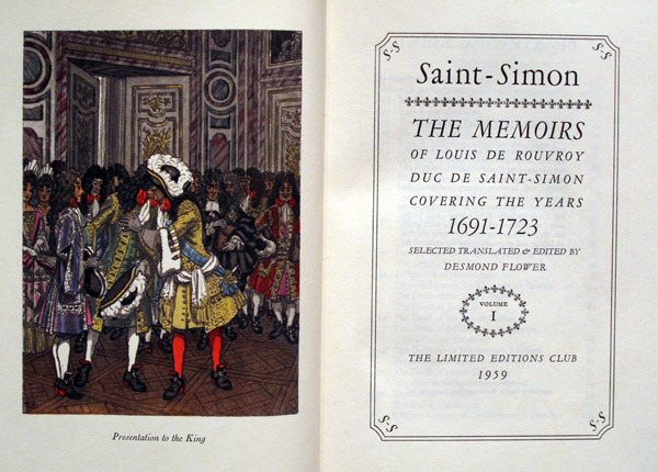 Saint-Simon. The memoirs of Louis de Rouvroy, duc de Saint-Simon, covering the years 1691-1723. Selected translated & edited by Desmond Flower [New York]: The Limited Editions Club, 1959.