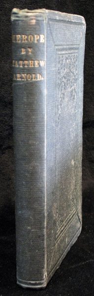 First edition. Publisher’s presentation copy, with their embossed Presentation stamp on the title-page and dedication page. Matthew Arnold (1822-1888) was an English poet and social critic and was known as the third great Victorian poet (after Tennyson and Robert Browning). Although he knew success in his career, he also received criticism (although he professed not to read Keats, much of his poetry is so similar to Keats’ style, that he is almost derivative). Arnold demonstrated his admiration of Greek literature and its “noble serenity†in dealing with a chaotic world in Merope, in which he re-interprets a traditional Greek tragedy, whilst experimenting with a range of unusual meters.