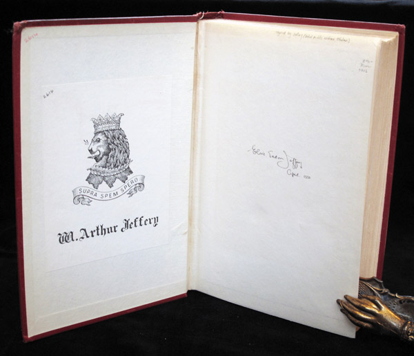 Octavo. 288 pp. With photographic frontispiece portrait of Craufurd, 18 plates and 3 text maps. Red publisher’s cloth, some soiling to front cover, spine lightly sunned, otherwise a very good copy. From the library of noted middle-East scholar and Columbia professor of Semitic languages W. Arthur Jeffery, with his bookplate as well as the ownership inscription of his wife, Elsie Gordon Jeffery dated April 1933.