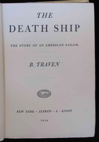 First American edition of Traven’s first novel (first published in German as Das Totenschiff in 1926). This edition was preceded by the British edition by a few months, but that translation was by someone else; this version is Traven’s own English translation, and is considered to be superior (a similar circumstance occurred with his most famous novel, The Treasure of the Sierra Madre, 1935).