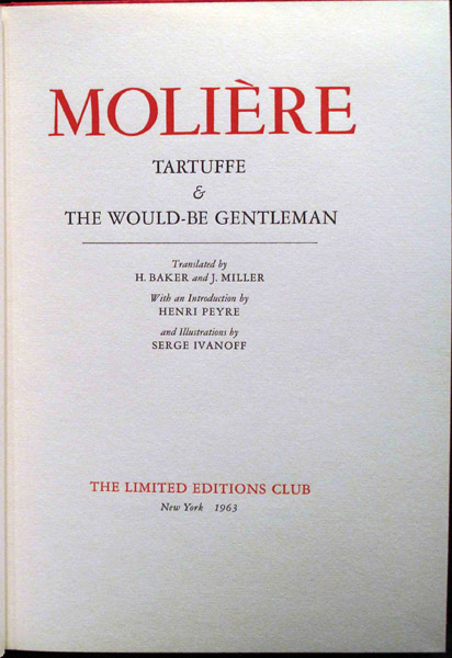 Tartuffe [or The Hypocrite]; The Would-Be Gentleman. Translated by H. Baker and J. Miller With an Introduction by Henri Peyre and Illustrations by Serge Ivanoff New York: The Limited Editions Club, 1963.