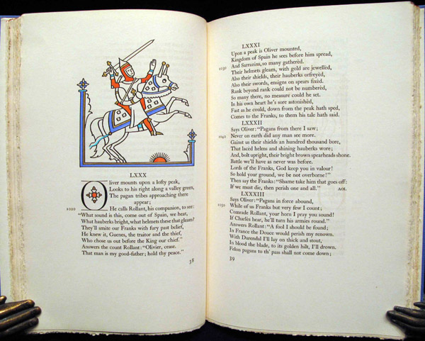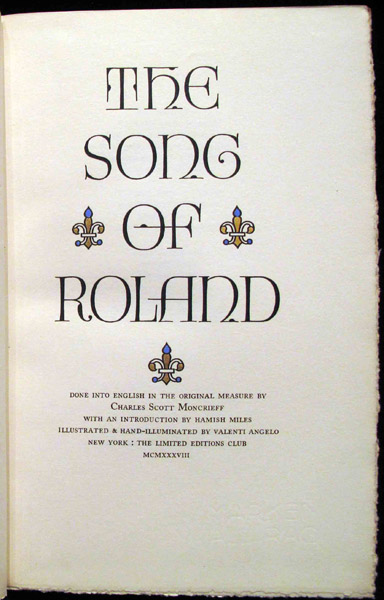 The Song of Roland. Done into English in the original measure by Charles Scott Moncrieff with an introduction by Hamish Miles. Illustrated and hand-illuminated by Valenti Angelo. New York: The Limited Editions Club, 1938.