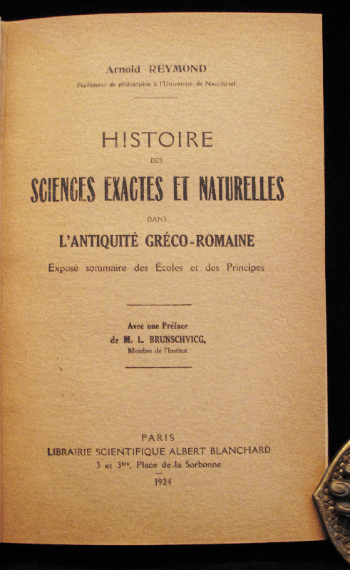 Histoire des Sciences Exactes et Naturelles dans l’Antiquité Gréco-Romaine. Exposé Sommaire des Écoles et des Principes(Bound with)LAURAND, L[ouis]. Manuel des Études Grecques et Latines. Appendice I: Les Sciences dans l’Antiquité. Paris: Auguste Picard, 1923. Paris: Librairie Scientifique Albert Blanchard, 1924.