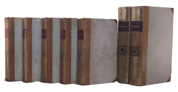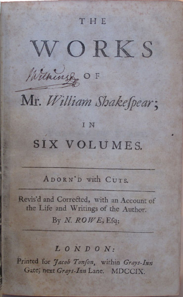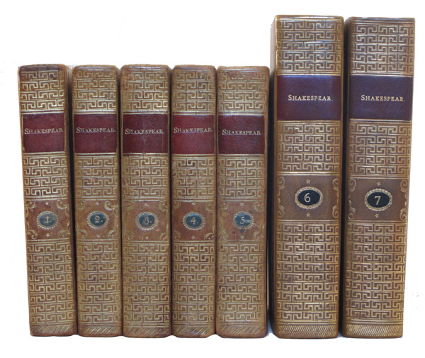 The Works of Mr. William Shakespear;. in Six Volumes. Adorn’d with Cuts. Revis’d and Corrected, with an Account of the Life and Writings of the Author. By N. Rowe, Esq. London: Printed for Jacob Tonson, 1709. (together with) SHAKESPEAR[E], William; [GILDON, Charles] The Works of Mr. William Shakespear. Volume the Seventh. London: Printed for Jacob Tonson, within Grays-Inn Gate; Printed for E. Curll at the Dial and Bible, 1709;1710.