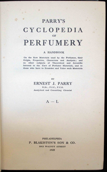 Parry’s Cyclopedia of Perfumery. A Handbook. On the Raw Materials used by the Perfumer, their Origin, Properties, Characters and Analysis; and on other subjects of Theoretical and Scientific Interest to the User of Perfume Materials, and to those who have to Examine and Value such Materials. Philadelphia: P. Blakiston’s Son & Co., 1925.