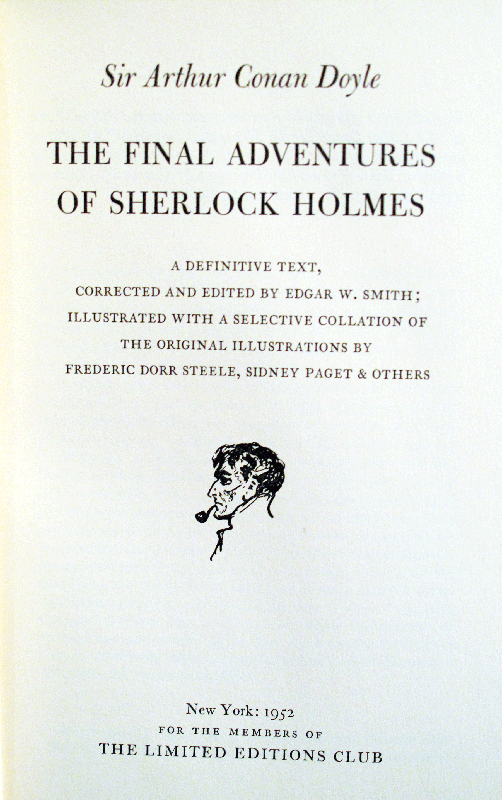 The Adventures of Sherlock Holmes; The Later Adventures of Sherlock Holmes; The Final Adventures of Sherlock Holmes. A definitive text, corrected and edited by Edgar W. Smith, with an introduction by Vincent Starrett, and illustrated with a selective collation of the original illustrations by Frederic Dorr Steele, Sidney Paget and others. New York: The Limited Editions Club, 1950; 1952.