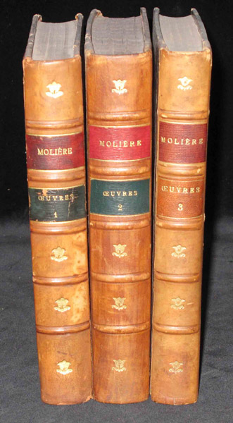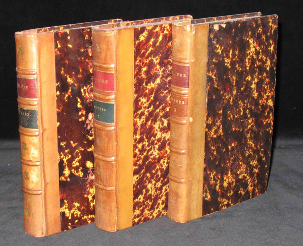 Three small octavo volumes. With introductory essay on the life of Moliere by Voltaire. Text in French. Contemporary quarter calf over marbled paper boards. Spines tooled in gilt in a floral motif, with burgundy and green gilt morocco lettering labels (volume III has burgundy and brown labels), five raised bands, all edges marbled, marbled endpapers. Slightly rubbed, minor wear to corners. Still, a very good set.