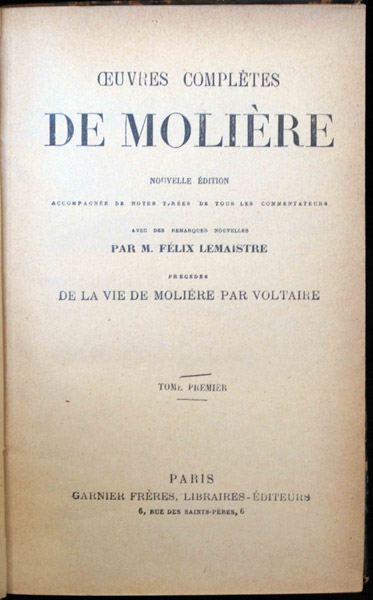 Oeuvres Completes de Moliere. Paris: Garnier Freres, [ca. 1870].
