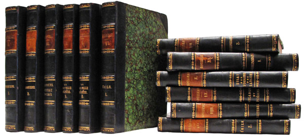 Complete in twelve small octavo volumes. Portrait frontispiece in volume I. Text in French. Bound in near contemporary half black calf over green marbled paper boards. Spines ruled and lettered in gilt, gilt brown morocco lettering labels, speckled edges. Labels browned and lightly worn, some rubbing to edges. Overall, a very good set.