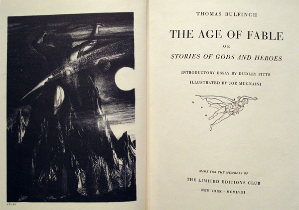 The Age of Fable. or Stories of Gods and Heroes. Introductory Essay by Dudley Fitts. Illustrated by Joe Mugnaini. New York: The Limited Editions Club, 1958.