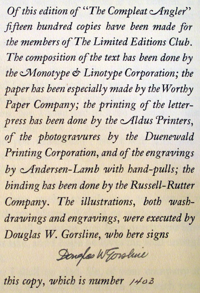 The Compleat Angler. or, the Contemplative Man's Recreation: Being a Discourse of Fish and Fishing for the perusal of Anglers, with Instructions, How to Angle for a Trout or Grayling in a Clear Stream, by Charles Cotton; and with an introduction by James Russell Lowell. Illustrated by Douglas W. Gorsline. New York: The Limited Editions Club, 1948.