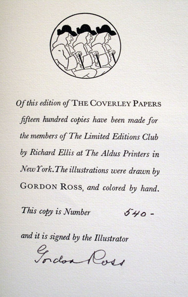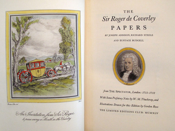 The Sir Roger de Coverley Papers. from The Spectator, London: 1711-1712; With Some Prefatory Notes by W. M. Thackeray, and Illustrations Drawn for this Edition by Gordon Ross. The Limited Editions Club,