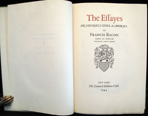 The [Essays of Sir Francis Bacon]. The Essayes, or Counsels Civill & Morall of Francis Bacon, Baron of Verulam, Viscount Saint Alban. New York: The Limited Editions Club, 1944.