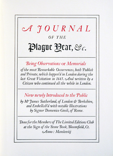 A Journal of the Plague Year. Being Observations or Memorials of the most Remarkable Occurrences, both Publick and Private, which happen'd in London during the last Great Visitation in 1665. And written by a Citizen who continues all the while in London. Now newly Introduced to the Public by Mr. James Sutherland, of London & Berkshire, and Embellish'd with notable Illustrations by Signor Domenico Gnoli, of Rome. Bloomfield, Ct.: The Limited Editions Club, 1968.
