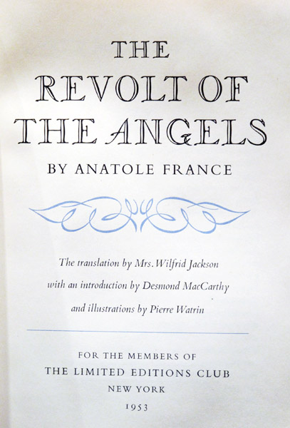 The Revolt of the Angels. The translation by Mrs. Wilfrid Jackson with an introduction by Desmond MacCarthy and illustrations by Pierre Watrin. New York: The Limited Editions Club, 1953.