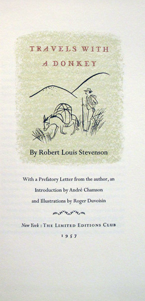 Travels With a Donkey [in the Cévennes]. With a Prefatory Letter from the author, an Introduction by Andre Chamson and Illustrations by Roger Duvoisin New York: The Limited Editions Club, 1957.
