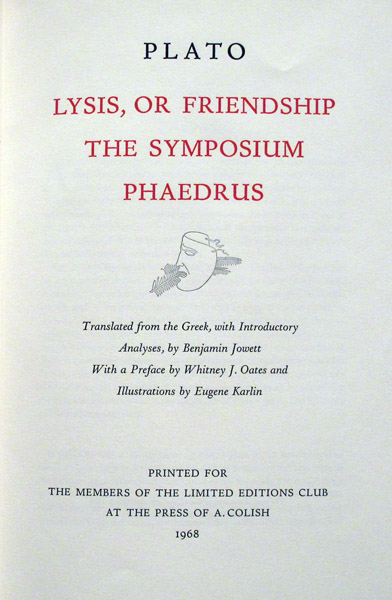 Lysis, or Friendship; The Symposium; Phaedrus. Translated from the Greek, with Introductory Analyses, by Benjamin Jowett. With a Preface by Whitney J. Oates and Illustrations by Eugene Karlin [Mount Vernon]: The Limited Editions Club, 1968.