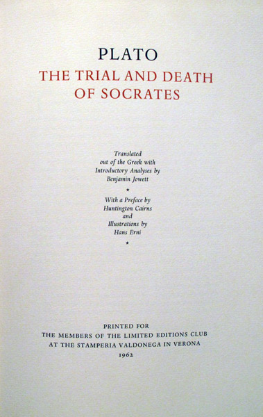 The Trial and Death of Socrates. Translated out of the Greek with Introductory Analyses by Benjamin Jowett. With a Preface by Huntington Cairns and Illustrations by Hans Erni Verona: The Limited Editions Club, 1962.