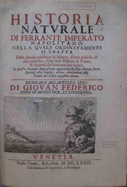 Historia Naturale de Ferrante Imperato Napolitano. Nella Quale Ordinatamente si Tratta. Della diversa condition di Minere, Pietre Pretiose, & alter curiosita. Con varie Historie di Piante, & Animali, sin’hora non date in luce. In questa Seconda Impressione aggiontoui da Gio Maria Ferro. Spetiale alla Sanita, alcune Annotationi alle Piante nel Libro vigesimo ottavo. Venetia: Presso Combi, La Nou, 1672.