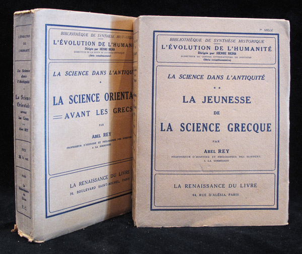 First edition of the first two volumes of Rey's monumental historical work on science in antiquity. Issued in five volumes from 1930-1948, in was the result of an extensive amount of research and careful study - volume one treats the scientific discoveries made in the Eastern world prior to ancient Greeks, focusing particularly on the discoveries and advances of the Chaldeo-Assyrians, the Egyptians, the Chinese and the Hindus. Volume two is an exploration of "youth" of Greek science, covering the beginnings of Hellenic science and the School of Milet, the evolution of scientific thought during the time of Pythagoras, mathematics and physics from the end of the 6th century to the middle of the 5th, as well as the technological advances made through the middle of the 5th century.