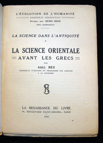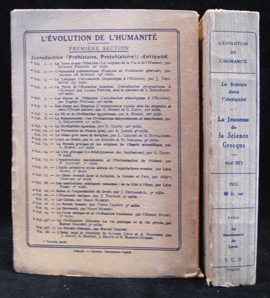La Science dans l'Antiquité. 1. La Science Orientale avant les Grecs (offered with) 2. La Jeunesse de la Science Greque. Paris: La Renaissance du Livre, 1930; 1933.