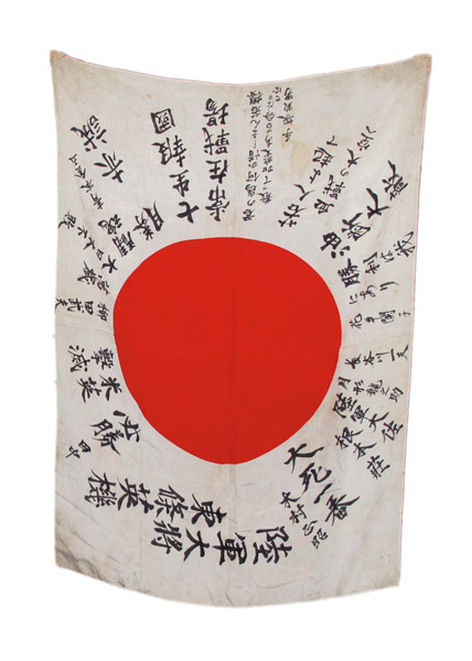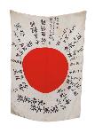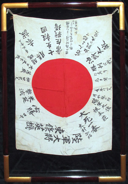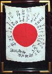 25 x 34 inches, printed on white silk with red central disc. Beautifully preserved in a custom double glazed frame box - flag is viewable from both sides. Some damp-staining edges, not affecting notations - an excellent example. Nineteen manuscript notations in Japanese emanating from central disc, in a pattern reminiscent of the ensign of the Japanese Imperial Army.