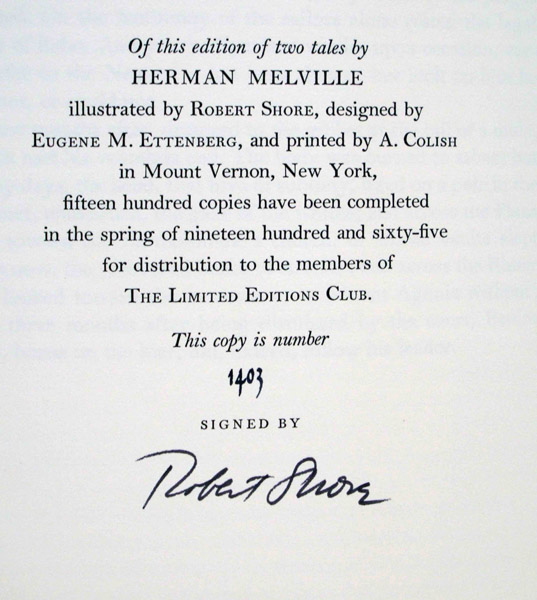 Billy Budd; Benito Cereno. With an introduction by Maxwell Geismar and paintings by Robert Shore. New York: The Limited Editions Club, 1965.