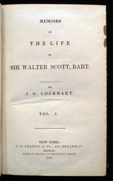 Memoirs of the Life of Sir Walter Scott, Bart. New York: C. S. Francis & Co., 1851.