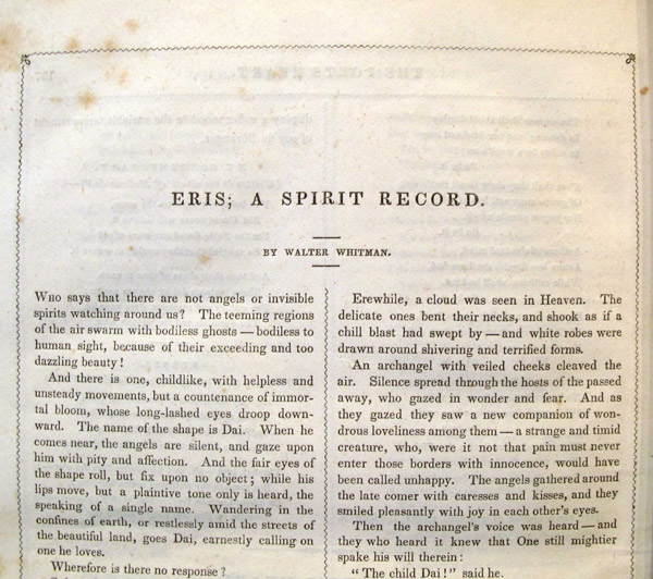 First appearance in print of "Eris; A Spirit Record", Walt Whitman's poetic tale of angels and the purity of mortal love.