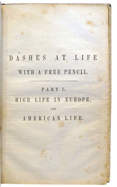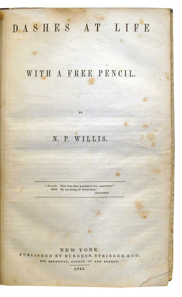 WILLIS, N[athaniel] P[arker]. Dashes at Life with a Free Pencil. Part I: High Life in Europe, and American Life. New York: Burgess, Stringer, & Co., 1845.