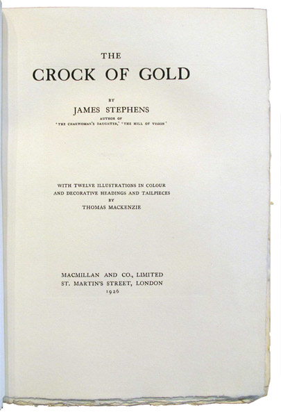 The Crock of Gold. With twelve illustrations in colour and decorative headings and tailpieces by Thomas Mackenzie London: Macmillan and Co., Limited, 1926.
