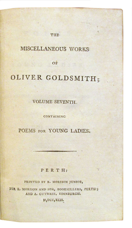Poems for Young Ladies. The Miscellaneous Works of Oliver Goldsmith, Volume Seventh Perth; Edinburgh: Printed by R. Morison Junior, for R. Morison and Son, Booksellers; and A. Guthrie, 1792.