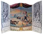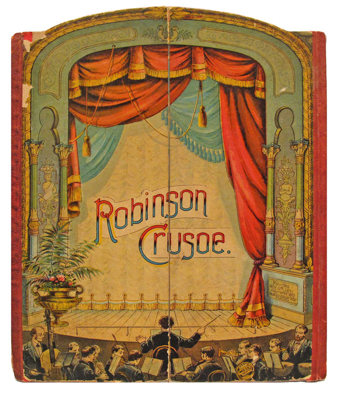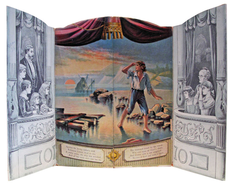 Quarto. [12] pp. Color pictorial publisher's boards backed on either side with red cloth. Entire volume designed as a theatre staging a play, with stage, proscenium arch, and orchestra pit on front cover, poetic adaptation and scenes from the story on each page, and audience members on verso of each page. Volume opens from center, allowing pages on each side to form a complete scene together. Some edge-wear and mild soiling to boards, small chips from front cover and large chip from rear, a few pages neatly rehinged, but overall still a very good copy of this fragile work.